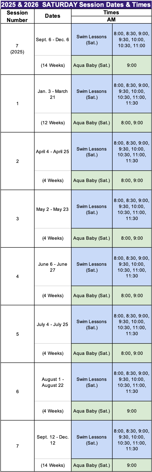 Spring & Summer Sessions: Monday-Thursday or Saturdays.
